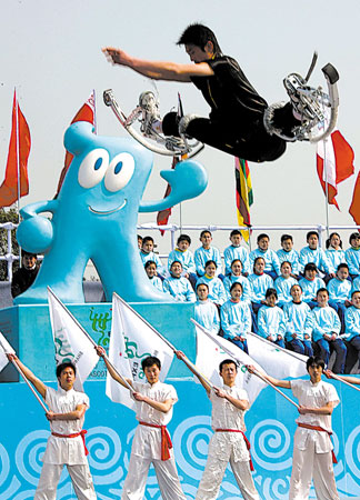 近200面参展国国旗迎风飘扬,9个硕大的海宝雕塑矗立在博乐广场,21个四面灯箱近300幅图片组成详细介绍世博知识的世博长廊。嘉定区昨天启动迎世博“海宝欢乐行”系列活动,从上海世博会倒计时400天开始,围绕倒计时400天、一周年、300天、200天等节点开展集中宣传动员活动,让海宝带着世博走近千家万户。(薄小波)