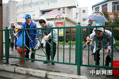 中新网上海3月27日电(郑莹莹 郁玫)27日,上海浦东新区政府官员来到毗邻世博园区的周家渡街道,和社区居民一起擦洗马路栏杆和路边宣传橱窗,拉开坐拥上海世博会约三分之二场馆的浦东新区迎世博倒计时四百天的系列活动序幕。