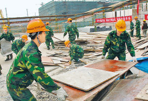 4月6日至12日,“南京路上好八连”官兵来到上海世博会浦西园区、浦东“中国馆”和“临时场馆”三个施工地点义务劳动。他们除完成安排的任务外,还利用休息时间,开展了理发、缝衣补鞋等便民服务。张宁峰摄