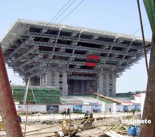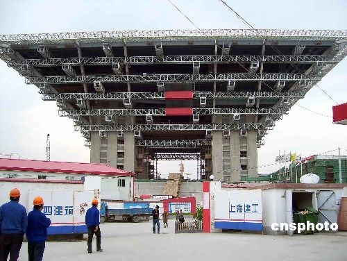 4月20日,上海世博会中国馆建筑主体挂上第一抹“中国红”。近日,建设中的上海2010年世博会中国馆正式进入装修阶段,中国馆主体建筑正南方向中间位置的第八、九层开始安装红色的外立面装饰板。中新社发 井韦 摄