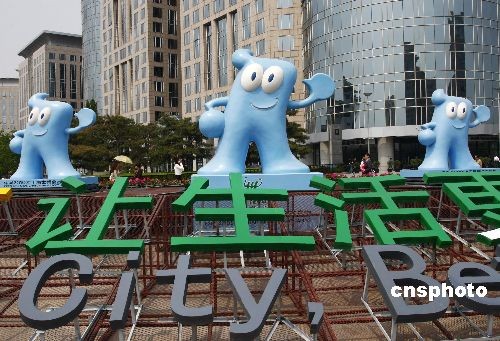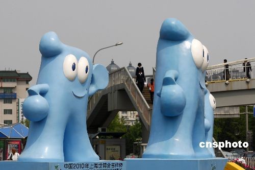 4月28日,上海世博会吉祥物“海宝”亮相北京东单路口处,为世博会倒计时一周年造势。2010年上海世博会吉祥物“海宝(HAIBAO)”,意为“四海之宝”,以蓝色汉字的“人”作为核心创意,既反映了中国文化的特色,又呼应了上海世博会会徽的设计理念。中新社发 郑雄增 摄