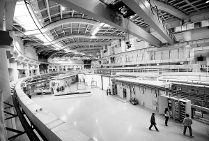 出光的具体过程是这样的,高压电从直线加速器扣动“电子枪”,发射出无数个电子。它们在直线隧道内的真空电磁场中疾行,加速至接近光速水平,能量达到150兆电子伏特(150M eV)。接着,这股低能光束线便打弯“注入”内圈小环隧道———增强器,能量在转圈的瞬间被提升22倍左右,变成35亿电子伏特(3.5G eV)的高能光束线,最后“注入”外圈大环隧道———比400米跑道还长的储存器。高能光束线昼夜不停地高速穿行,并沿着大环不断“转圈”,在不同切线方向上“条分缕析”,引出数十束不同波长的形形色色的光,覆盖从远红外线到硬X射线的所有波段,供外围大厅内成百上千的实验站科研人员进行多学科研究。