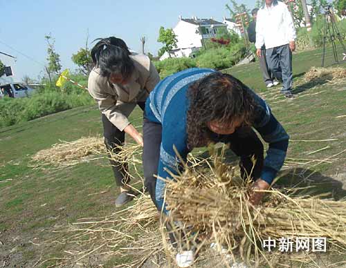 连日来,上海市及各区县纷纷举行各种形式的庆祝活动,迎接二0一0年上海世博会开幕倒计时一周年。在今天下午的廊下镇记者看到,一个多由农民参加,颇有江南乡村特色的体育节拉开了帷幕。据主办方介绍,这个名为“健康迎世博”的廊下镇第二届乡村体育节,旨在表达当地农民希望通过体育运动来迎接世博会开幕的心情,同时也为“五一”假期里来此郊游的沪上市民提供一个参与乡村游戏的舞台。将持续至5月3日的本届乡村体育节,设立的十个体育游戏项目,多是从日常的农活中提炼而来的,包括捆稻草、插秧、搓跳绳、抢在暴风雨前、抛接米袋和运砖造房子等,充满了乡村野趣。
