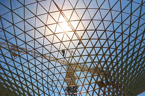 中新网4月30日电 据上海世博会官方网站消息,今天,世博轴上首批两个喇叭状的阳光谷正式落成,同时顶棚膜结构张拉启动,这标志着世博轴上部主体工程即将全面完工。上海世博会执委会专职副主任钟燕群、上海世博局副局长丁浩等出席仪式。钟燕群宣布启动世博轴顶棚膜结构张拉。
