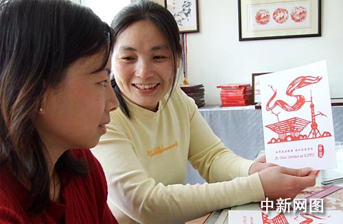 中新网上海5月1日电(舒祖康 郑莹莹)一个线条流畅的志愿者标志图形——“中国心”飘在中国馆的上空,这是浦东上钢世博社区剪纸坊的师生们为上海世博会倒计时一周年设计的剪纸图案。