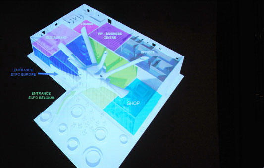 5月18日,在比利时首都布鲁塞尔,设计师在上海世博会比利时国家馆设计方案揭晓仪式上讲述设计理念。当日,上海世博会比利时国家馆设计方案在此揭晓。比利时展馆面积为5250平方米,其中1000平方米将提供给欧盟展示。
