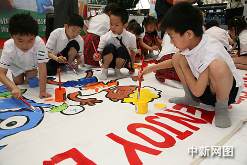 中新网上海6月5日电(苏巍巍 陈贝)6月5日上午,来自中、美、法、德等不同国家和地区30位小朋友欢聚浦东机场2号航站楼,在10米长卷上描绘世博,在“许愿树”上祝福世博。