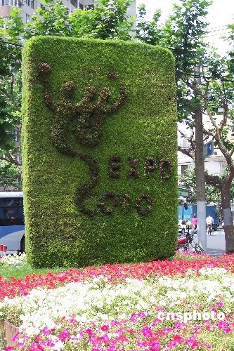 6月16日,用绿草装饰的2010年上海世博会会徽和世博会英文简称“EXPO”景观亮相上海街头,营造了迎世博的氛围。中新社发 周东潮 摄