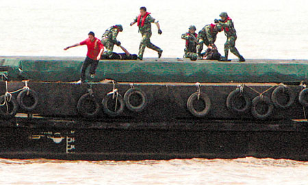 “跳帮!”一声令下,10余名海警官兵利用两船靠近和波浪起伏间隙最小的瞬间,飞身鱼跃,纷纷越过船艇护栏,跳到货轮上。海警击毙一名“恐怖分子”,制伏两人,另一名“恐怖分子”慌不择路跳海,也被飞身入海的海警抓获。此时藏匿在机舱的4名“恐怖分子”瞅准空隙,驾艇逃窜。