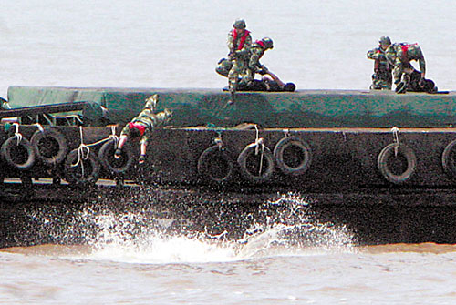 “跳帮!”一声令下,10余名海警官兵利用两船靠近和波浪起伏间隙最小的瞬间,飞身鱼跃,纷纷越过船艇护栏,跳到货轮上。海警击毙一名“恐怖分子”,制伏两人,另一名“恐怖分子”慌不择路跳海,也被飞身入海的海警抓获。此时藏匿在机舱的4名“恐怖分子”瞅准空隙,驾艇逃窜。
