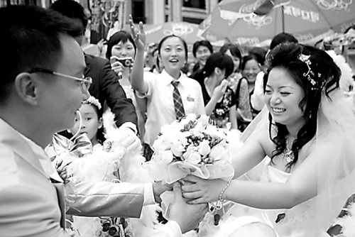 仪式中,上海世博会志愿者服务站破例来校为新人们现场登记,8位新人婚礼当天完成一桩心愿———光荣加入上海世博会志愿者队伍。(彭薇 陈焕联)