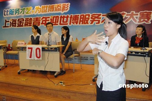 2009年7月3日,上海金融青年迎世博服务才艺大赛在当地举行。来自上海金融系统的银行、保险、证券等20多个单位的代表参加了比赛,展示了上海窗口服务行业职工“比服务环境,赛整洁优美;比服务设施,赛安全便捷;比服务品质,赛仪态仪表;比服务水平,赛技术技能;比服务管理,赛常态长效”的风采。 中新社发 海牛 摄