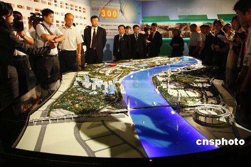 7月5日,上海世博会倒计时300天之际,由世博会组委会主办的“走进世博会”大型展览在北京首都博物馆开幕,国务院副总理王岐山、上海市委书记俞正声等出席启动仪式。本次展览汇集了最全面的上海世博会筹办进展资料,其中首次亮相的59个展馆实物模型、中国馆“万花筒”、张艺谋团队最新制作的世博园虚拟电影,是本次展览会的亮点。中新社发 郑雄增 摄