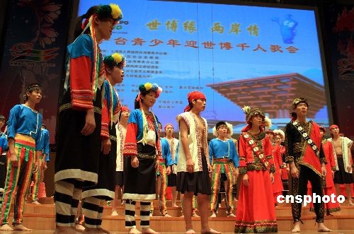 7月5日,“世博情、两岸情2009沪台青少年迎世博千人歌会”,在上海东方艺术中心举行。来自台湾的400名中学生和上海的1000名中学生,共同在“千人歌会”中以歌会友。图为台湾大里高中学生身穿少数民族服装声情并茂演唱,成为千人歌会的亮点。中新社发 潘索菲 摄