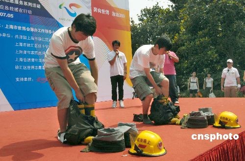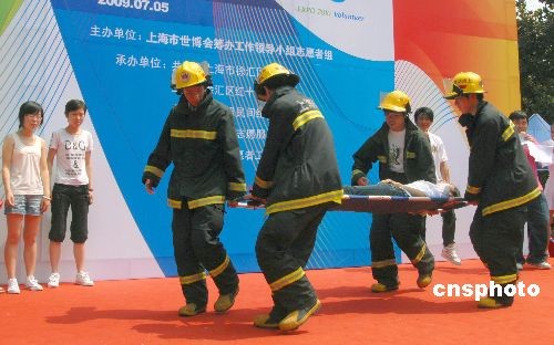 7月5日是中国2010年上海世博会倒计时300天,“我们在你身边”世博会大型志愿者集中服务行动在申城各街道社区拉开帷幕,世博志愿者在徐家汇公园进行模拟心肺复苏应急救援演示,活动现场还有消防中队官兵宣讲高楼逃生技巧、灭火器操作方法等,旨在普及、宣传应急救援知识,提高公众的安全意识和应变能力,保障世博会游客安全。中新社发 海牛 摄
