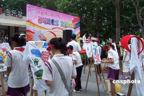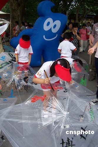 7月5日,中国2010世博会进入300天倒计时,上海市静安区的中、小、幼学生在静安公园门口参加“彩笔绘世博 友谊传四海”活动,一幅幅画表达了学生们喜“迎世博”的心愿。中新社发 周东潮 摄