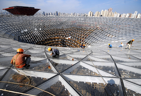 2009年7月14日,上海世博会标志建筑——世博轴阳光谷玻璃幕墙安装即将结束,6个巨型圆锥状“阳光谷”即将全部亮相。