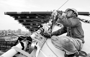 下午两点,记者带着温度计来到世博工地外国馆片区,阳光下,水银柱停留在40摄氏度上。走上5分钟,汗水湿透了全身。高温挑战着每个建设者的意志力。在法国馆将要完成的钢结构屋顶上,几个工人正在安装最后的钢架,为了避免晒伤,他们穿着长袖长裤的工作服,戴着安全帽。从屋顶爬下来时,每个人都像是刚从水里捞上来的。工人老张说,安全帽不能脱,汗水一刻不停地沿着帽子流下来,眼睛都睁不开,得一直用手擦。
