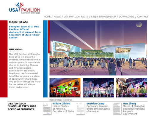 通过“最新动态”,网友可以清晰、直观地了解美国馆每一步的筹备动态;而在“美国馆概况”栏目中,网站全面介绍了美国馆的理念、组织方及参展目标等。此外,该网站还特别刊登了美国国务卿希拉里•克林顿等签发的关于美国参与2010年上海世博会的信函。