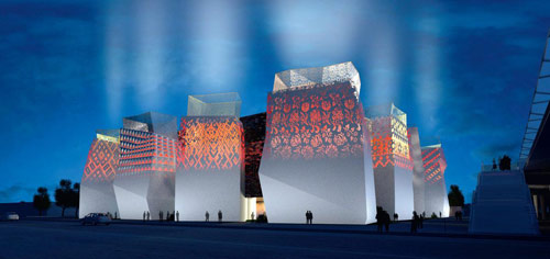 以“新俄罗斯:城市与人”为主题的俄罗斯馆由12个塔楼和“悬浮在空中”的立方体组成,外形设计类似古代斯拉夫人的小村落,象征着生命之花、太阳以及世界树(斯拉夫人枝叶繁茂的橡树)的根。塔楼由白、金、红三种颜色构成,白色和金色塑造了俄罗斯建筑的历史形象,而红色底色加上富有俄罗斯各民族元素的图案,则赋予了塔楼顶部镂空部分以生命力。