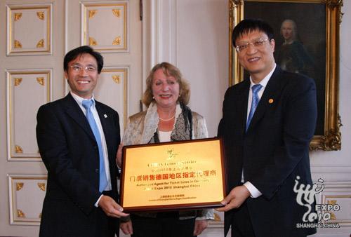德国当地时间8月29日,中国2010年上海世博会门票销售德国指定代理商授牌仪式在德国亚琛市政厅举行。上海世博局副局长陈先进代表上海世博局向德国西马远东服务公司总经理左军授牌。德国亚琛市副市长西尔特(Scheidt)女士等出席授牌仪式。