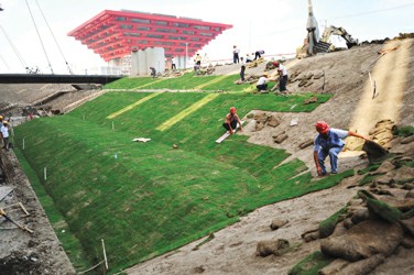 9月8日,世博工地绿化工程随场馆建设进度全面展开。昨天,记者在世博工地世博轴阳光谷侧见到,建设者正在铺草皮(见图),昔日工地的黄泥土和刚刚铺好的绿色形成鲜明对照。(郭一江)