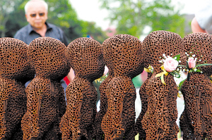 世博会建设留下的破铜烂铁摇身一变,成了承载艺术家奇思妙想、宣传节能环保的“精灵”。昨天(16日),2009年上海国际钢雕艺术节拉开帷幕,来自世界各地近百具由废弃金属改造的雕塑夺人眼球。前挡板抹上“口红”,轮胎和车身“穿”上彩色喷漆,报废铲车蜕变为“摩登女郎”。