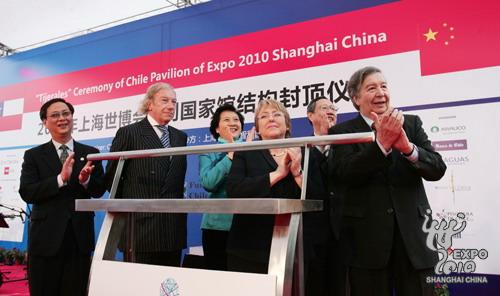 智利上海世博会总代表宋维和、智利驻华大使费尔南多•雷耶斯•马塔、上海世博局副局长黄健之、中国外交部拉美司副司长李宝荣、上海市外事办公室副主任吴金兰等出席了封顶仪式。中智两国官员共同将闻名全球的智利红酒注入一个冰雕的智利国家馆标志中,圆球内的智利红酒缓缓形成一条红色的纽带,连接起位于地球两端的中国和智利,象征着两国之间的亲密友谊。