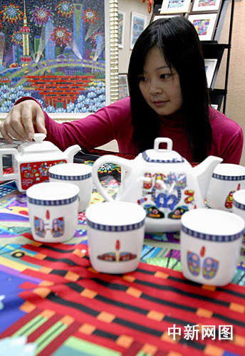 中新网11月24日电(万军)为迎接世博会到来,上海金山农民画院特地开发出系列世博题材创意延伸产品,其中A套以江南传统绣花鞋为图案、选用著名的唐山骨瓷为原料,名为“和谐”茶壶(喝与鞋的谐音),B套茶壶盖则用世博会中国馆图案制成,一经面世,即受到中外人士的关注。