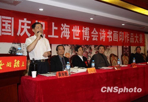 1月16日,中国庆祝上海世博会诗书画印作品大赛在北京吴东魁艺术馆启动。大赛结束后,将筛选出300余幅优秀作品在北京进行拍卖,全部利润将捐献给中国社会工作协会,用于四川灾区公益文化事业。中新社发 王彤 摄