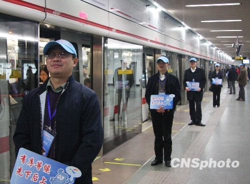 随着世博会的临近,上海市国资委的党员志愿者们积极响应市委、市政府的号召,持续深入地开展“世博先锋行动”。日前,市国资委机关的40多名党员志愿者们来到人民广场地铁一号线,他们佩戴着标有“世博先锋行动”的蓝色识别帽,手持印有“有序等候,先下后上”的文明提示语标牌,热情服务乘客。图为2月25日,志愿者们在地铁站服务乘客。中新社发 毛昭胜 摄