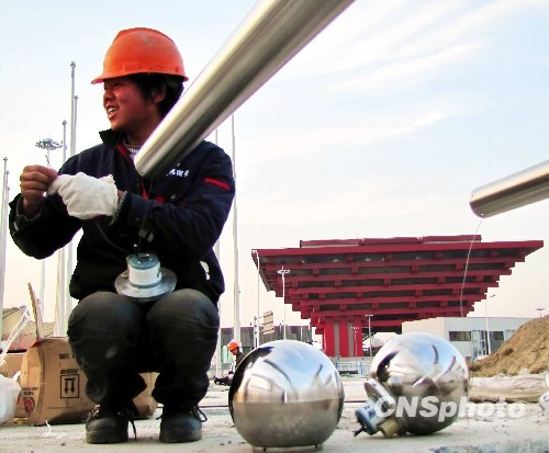 3月19日,随着上海世博会的日益临近,工人们正在加紧施工安装各国国旗的旗杆,预计整个工程有望三月底结束,届时200多个参展国的国旗将在世博园上空飘扬。