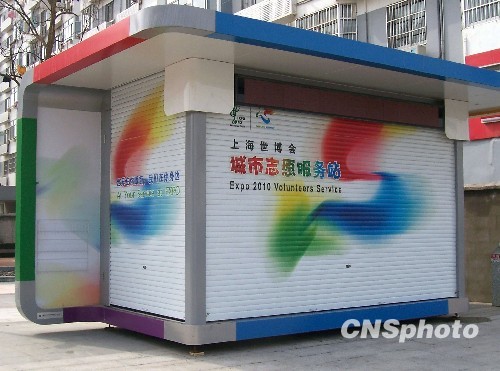 3月25日,“七彩之心”城市志愿者服务站点亮相上海街头。“七彩之心”站亭将在184天上海世博会展览期间工作,世博会志愿者将为中外游客提供信息咨询、文明宣传、语言翻译、应急救护等方面的服务。中新社发 周东潮 摄