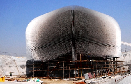 据了解,“生长”着6万余根亚克力“触须”的英国馆,也被称为“种子殿堂”。在每根亚克力杆的内端,都嵌有不同的植物种子,并配有半导体照明设施。白天,观众走进“种子殿堂”,犹如来到一个晶莹而充满生机的生命体;晚上,内光外透,熠熠生辉的“蒲公英”让人浮想联翩。