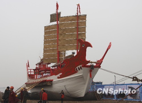 3月31日,由张家港市长明造船厂仿制的“遣唐使”船成功下水。作为中日友好文化交流的象征,该船将亮相上海世博会日本馆。“遣唐使”船是以日本飞鸟时代到平安时代(公元7世纪~9世纪)的遣唐使船为蓝本仿制的,船长32.5米、型宽6.8米,由30多名能工巧匠花费6个半月的时间建造完工,以1:1比例还原了当年遣唐使船的大小和结构。中新社发 朱晓颖 摄