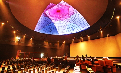 上完台阶,游客首先搭乖电梯来到49米的最上层。这是展馆最高、最大的展层,也是核心展示层“东方足迹”。一个超常规的电影厅是这层的点睛之笔,这里放映的是一部长达8分钟的“微型史诗电影”,诗意地展现了改革开放30年来中国在城市化建设中所作的努力和成就。