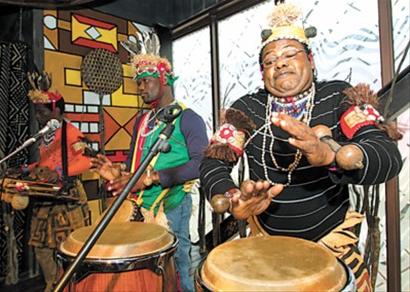 餐厅内用非洲图腾绘制成彩色墙面,由鸵鸟蛋做成精致吊灯,树枝和草帽拼接装饰屋顶,颇具非洲原生态氛围。餐厅二楼设有一个小舞台,就餐时,身着非洲传统民族服饰的非洲团队还会在舞台表演。(钟怡 徐蒙)