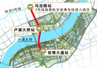 轨道交通世博专用线将在3站两区间内运行,承担入园、离园和园区内的越江交通。世博专用线3站两区间的长度为3.2公里,3个站点分别为内外交通转换的马当路站、浦西园区的卢浦大桥站、浦东园区的世博大道站。世博专用线配置6节编组列车4列,运营2列,备用2列,运营时间为9:00—24:00。另外在开园前与闭园后分别提供两个班次的工作人员通勤交通。