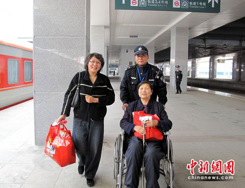 中新网徐州4月24日电 (耿晴 张良灿 侯启光)“您好,我是上海铁路民警,请问要到哪去?轮椅我来帮您推! ”在上海火车站6号候车室,来自徐州铁路公安处援沪安保民警边询问边接过一旅客手中的轮椅。“麻烦您帮忙了,我妈身体不好只能坐轮椅,谢谢!”身后,一位拿着两个大包裹的中年女性旅客连连道谢,民警会同世博志愿者一直将老人送上了列车。