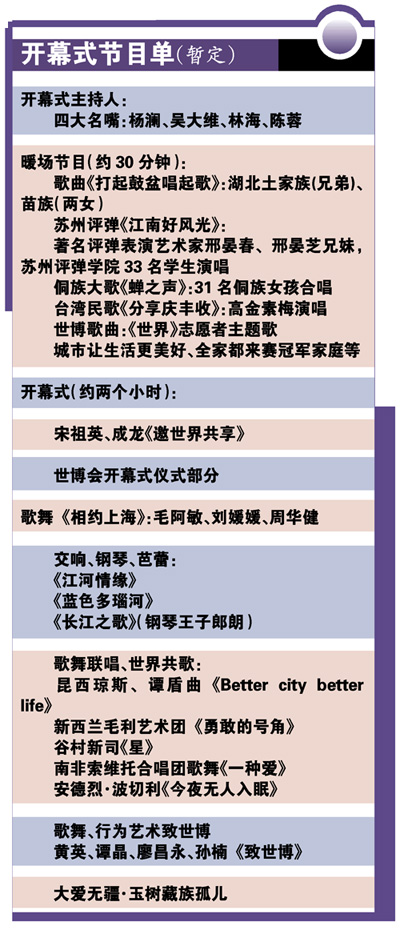 作为全世界人民的世博会,上海世博会开幕式将是中华风情和世界潮流的融合,“节目很精彩,大牌很多。”参加了世博开幕式彩排的邢女士告诉记者。正式演出时,首先登场的是宋祖英和成龙,一曲《邀世界共享》,向全世界人民发出邀请。在歌声中,56个民族身穿华服,还夹杂着杂技、飞天、长城等中国专属符号,非常具有民族特色。随后出场的毛阿敏、周华健、刘媛媛,用一曲《相约上海》,代表了上海向世界发出世博的邀请。