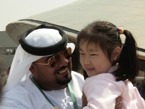 为了缓等待人群的焦急,阿联酋馆的工作人员还和游客互动,抱起了人群中的一个小女孩合照,让周围游客开怀不已。