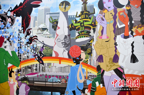 上海世博会城市最佳实践区大阪案例外墙的正面艺术作品是形部一平创作的《NEW WORLD》,作品长约30米,高3.2米,将大阪的传统与现代文化描绘得淋漓尽致。与案例中展示的“丰臣秀吉时期大阪图屏风”相呼应,创造性地表现了该案例的“环境先进城市•水都大阪的挑战”这一主题。