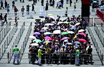 世博园6号入口位于世博轴南端,是世博园最主要的入口之一。昨日8时45分,入口处已聚了数百名游客。安检口共64个,其中东西两侧的10个入口是无包游客的快速通道。