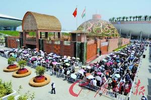 在英国馆,10时刚过馆前的队伍已神龙见首不见尾。那队伍从馆前一直绕,绕到了边上的小花园,绕过了旁边的公厕。“队伍的末尾在这儿,排队的人请尽量往外靠。”工作人员嚷着大嗓门不断地叫唤,“进园,至少3个小时吧。”她告诉记者。
