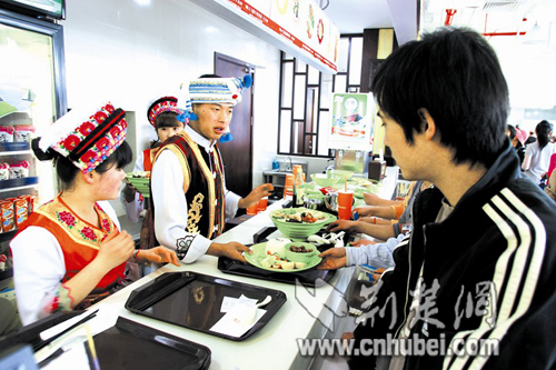 作为普通游客,我们还是首选中美食街。美食街大楼共两层,呈L形,多是各地名小吃和中西简餐。操作程序与武汉的各大美食广场如出一辙:收银窗口买卡充值,再持卡到各窗口“刷”,吃完后退卡退押金。价格比武汉稍贵,约20元-40元即可搞定。