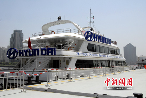 记者搭乘的世博游览12号有三层,共有300个客位,在第一层和第二层的座位上可以透过玻璃窗看江景,登上第三层甲板,可以欣赏黄浦江岸的风景,感受上阵阵江风,与遥遥相望的世博场馆合影。