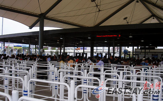 东方网记者随后在世博园7号口长清路入口目测发现,今天的客流比昨天多很多。目前,蛇形排队区已经排满了游客。等候区的遮阳棚已经撑开,大型电扇正在运作降温。不少游客表示已经排队近1小时,但前行速度缓慢。