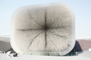 记者:我现在就在英国馆外大概50米左右的地方,英国馆占地6千平方米,是最大的自建馆之一,在英国馆的入口处外墙上印了这么一句话,“英国馆就是英国送给中国的礼物”。为什么这么说呢,因为整座的英国馆的外墙就像一个刚刚打开的精致礼品包装盒,种子圣殿就是礼物本身,在外面的露天广场则是刚刚取开的包装纸,游客们可以在上面休息,孩子们可以在上面嬉戏。