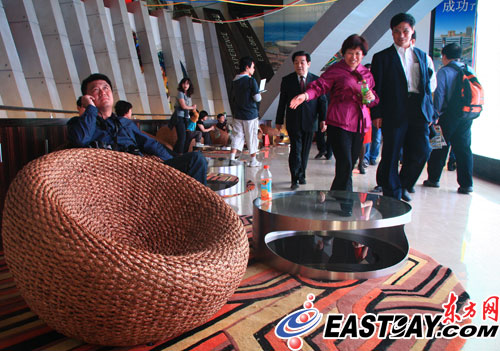 以“崛起的大国”为主题的南非馆这次完全舍弃了野生动物、美丽风光等常态化展示,而是用一个球形的视频墙占据在展馆中央,四周围放置着竹编的各式藤椅。负责筹建和部分设计的南非馆的中方负责人黎先生告诉东方网记者,由于南非馆将在世博会期间进行五大主题的展示,“只有视频能够最好展现出来。”