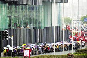 不过在沙特馆前的露天回廊,近百人的长队中,人人打伞,难免发生磕碰,不少游客希望这里也早点装上大阳伞。(许明)